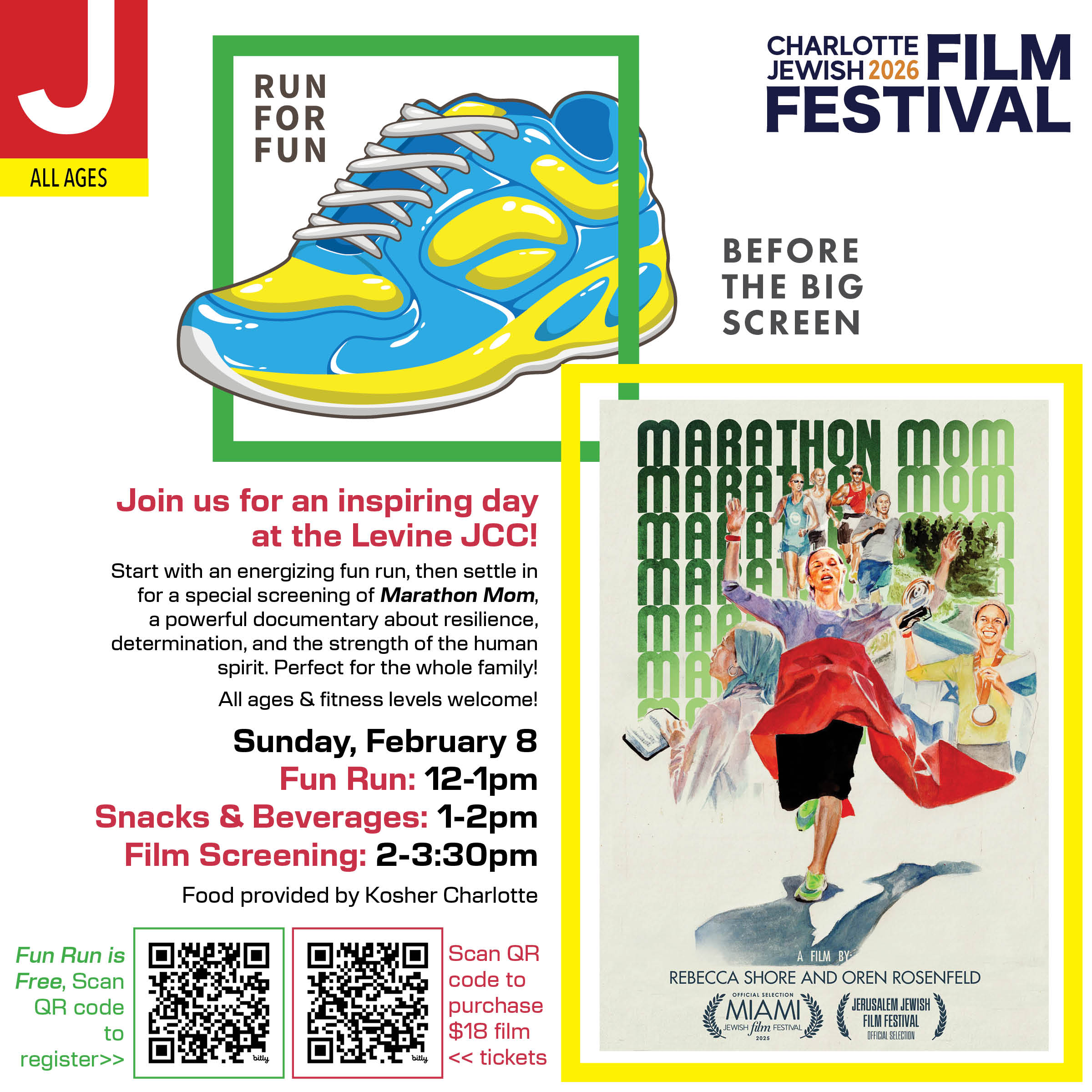 Join us at the Levine JCC for an uplifting afternoon featuring a fun run followed by a screening of Marathon Mom, the inspiring story of Beatie Deutsch—a mother of five whose journey of perseverance and determination motivates audiences of all ages. Tickets to Marathon Mom Sold Separately Below.