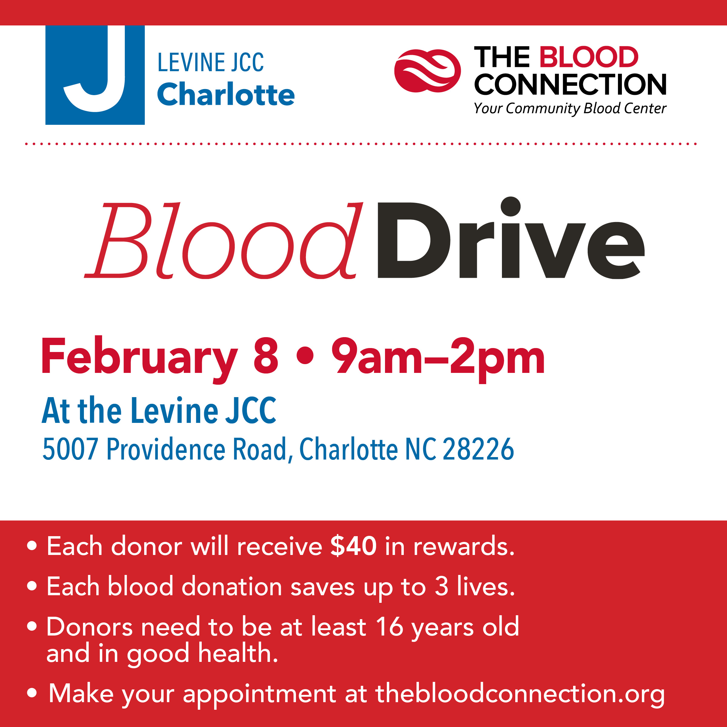 Join the Levine JCC and The Blood Connection for a community Blood Drive on February 8 from 9:00am–2:00pm. Each blood donation can help save up to three lives, and all donors will receive $40 in rewards. Donors must be at least 16 years old and in good health.