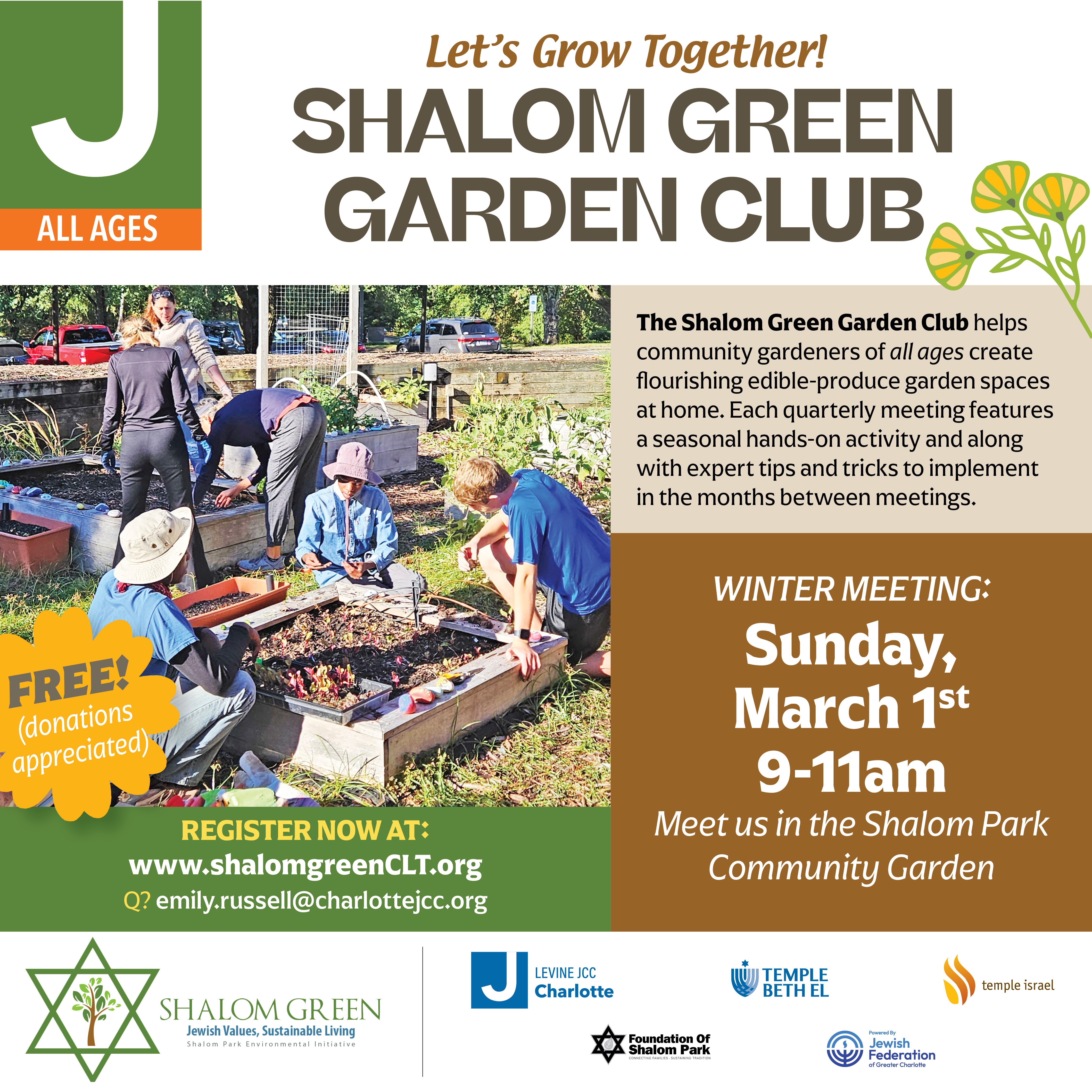 The Shalom Green Garden Club helps community gardeners of all ages create flourishing edible-produce garden spaces at home. Each quarterly meeting features a seasonal hands-on activity along with expert tips and tricks to implement in the months between meetings.