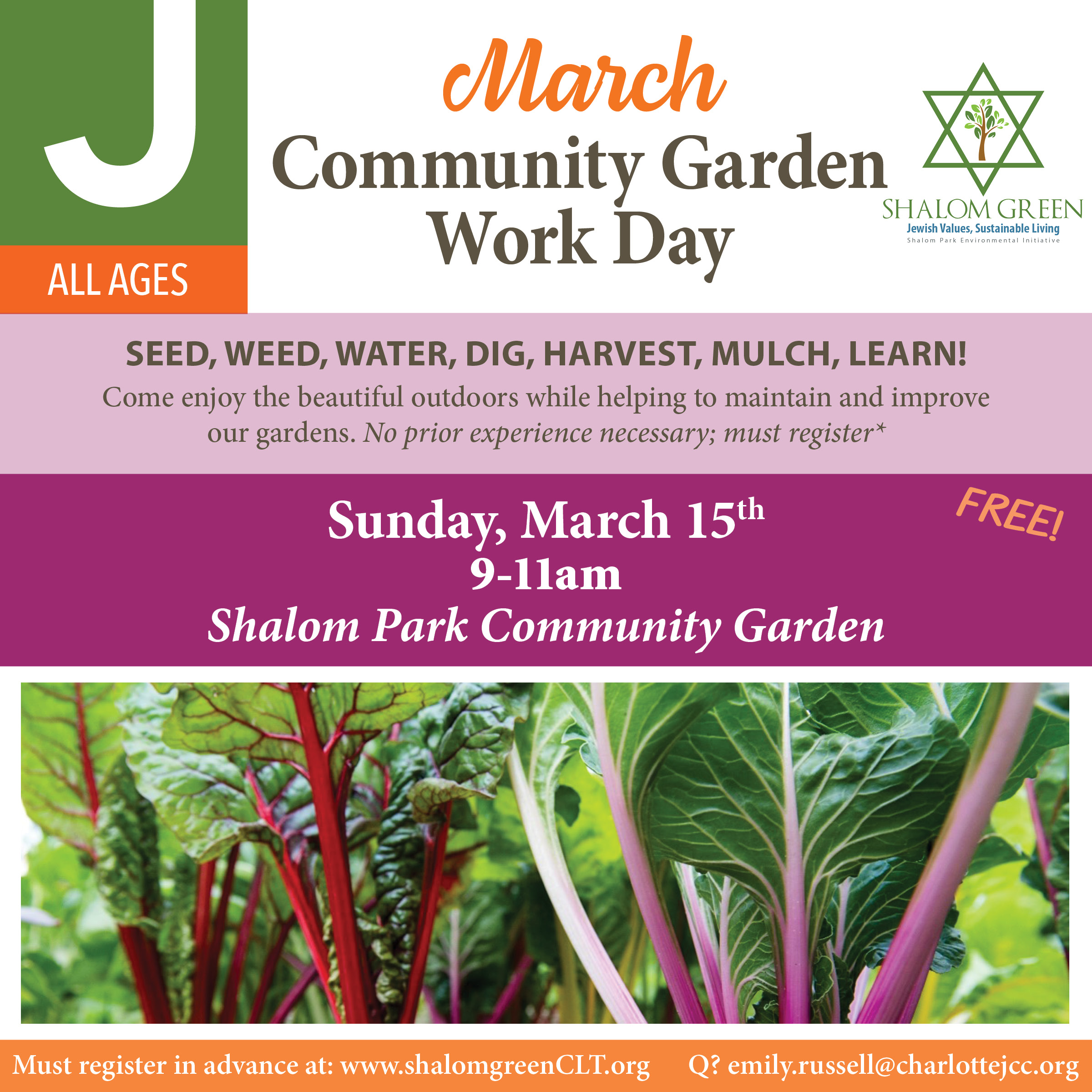 Come enjoy the beautiful outdoors while helping to maintain and improve our garden. Weed, seed, water, and learn! No prior experience necessary.