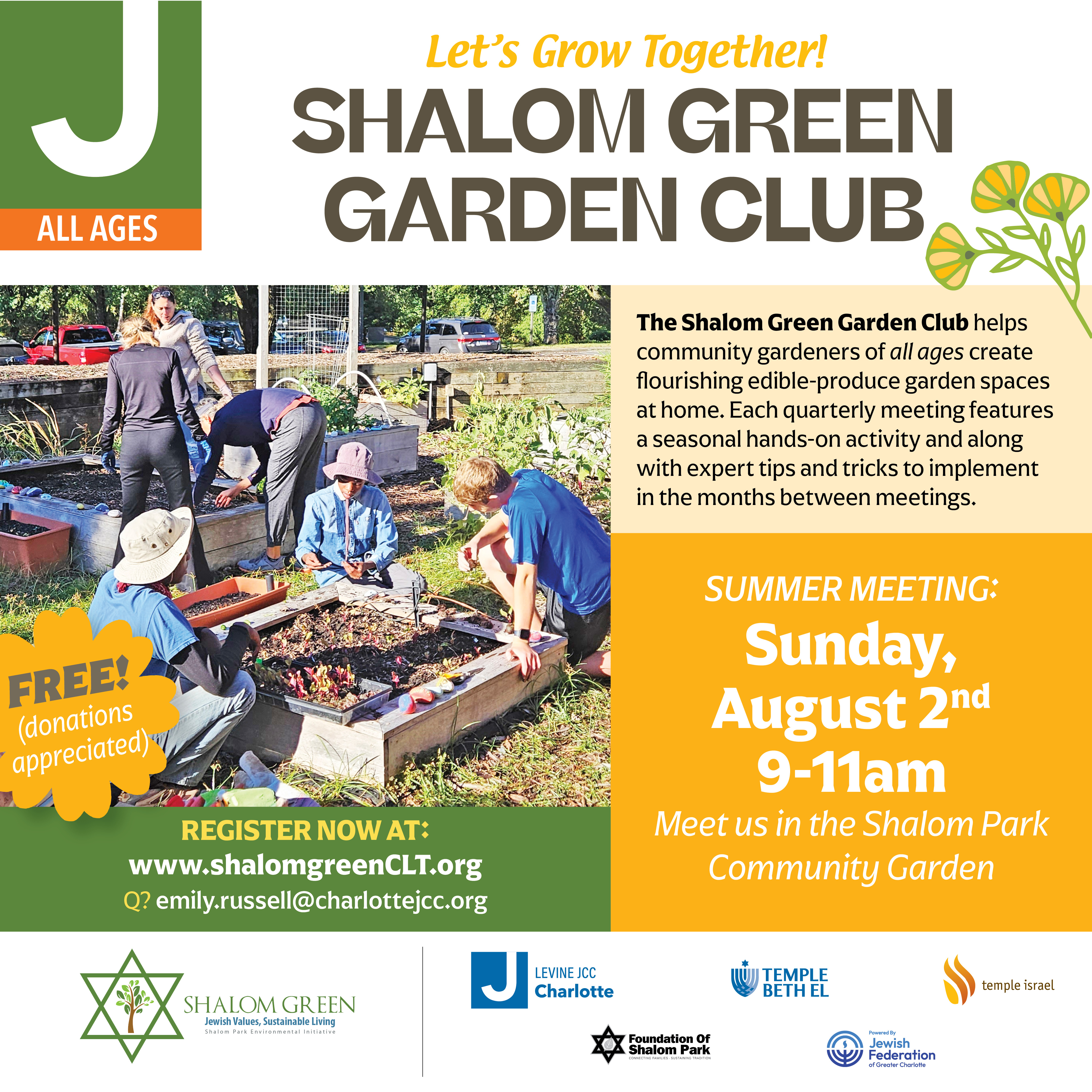 The Shalom Green Garden Club helps community gardeners of all ages create flourishing edible-produce garden spaces at home. Each quarterly meeting features a seasonal hands-on activity along with expert tips and tricks to implement in the months between meetings.