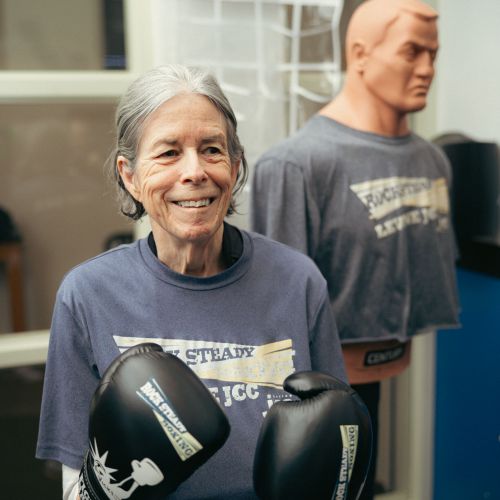 We soon learned that RockSteady, a boxing and exercise program that has been shown to slow the progression of Parkinson disease, was at the JCC! Suzanne Diorio evaluated Vicki and she was soon welcomed into a community of fellow "parkies" who are "fighting back" with a proven exercise routine!